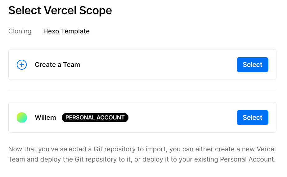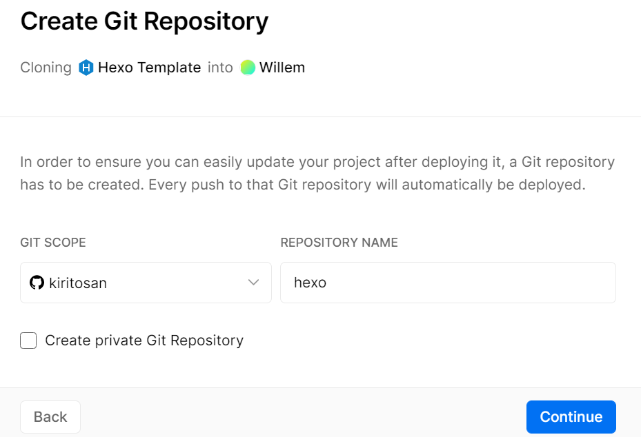 接下来到了创建Git仓库并自动导入Hexo模版的流程,选择下面的Github。